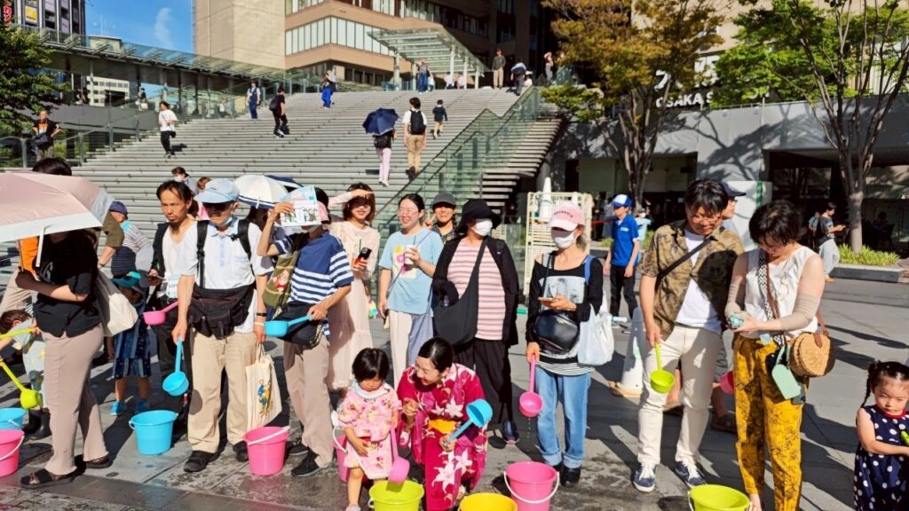 As people shouted, “Cool down Umeda!” and splashed water onto the pavement, a refreshing breeze spread through the plaza. In my enthusiasm, I almost splashed a photographer across from me—his camera nearly got a cooling too!