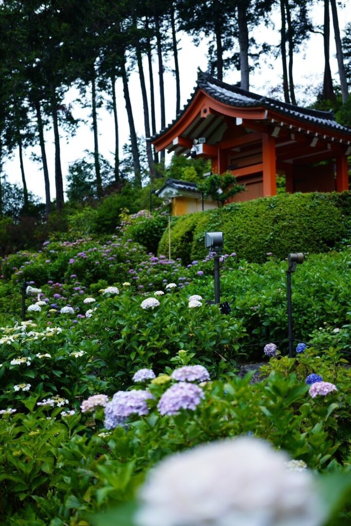 京都府宇治市にある三室戸寺は千年の歴史を持つ寺で、「花の寺」としても知られている。寺の庭園は静かで安らかであり、四季折々の花が古い建物に鮮やかな彩りを添えている。