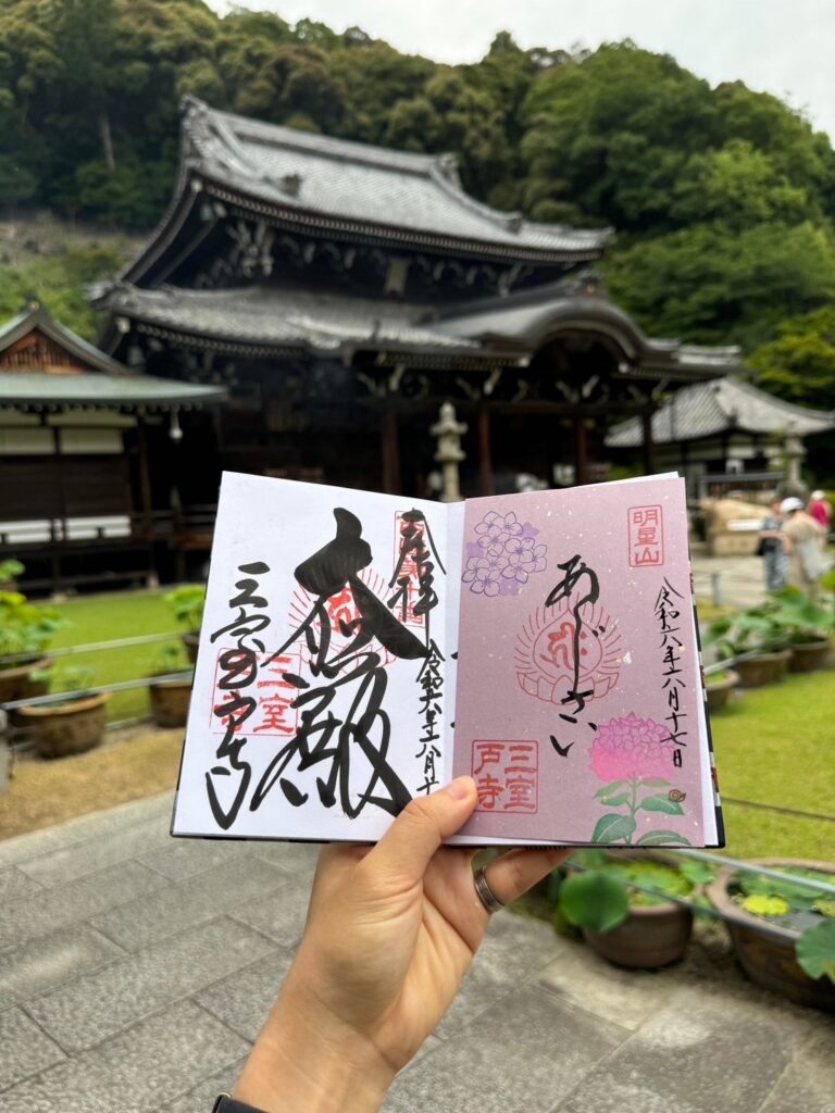 Speaking of goshuin (temple stamps), the seasonal limited versions at Mimuroto-ji are not to be missed. From June to August, special kirie goshuin (papercut-style stamps) are available, themed around hydrangeas and lotuses. The hydrangeas are bright and cheerful, while the lotuses have a cool, calming presence. The papercut technique adds depth and dimension, making these stamps not just collectibles but miniature works of art.