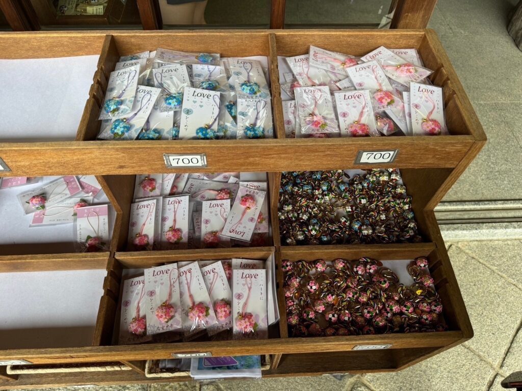 One particular charm featuring a heart-shaped hydrangea is tied to a fascinating legend. In the hydrangea garden, visitors occasionally come across a naturally occurring heart-shaped blossom. It is said that finding one foretells the arrival of a wonderful romance. Luckily, we managed to spot one ourselves. Just then, two elderly Japanese women nearby, even more excited than we were, eagerly pointed it out and told us about its meaning. I gratefully embraced the blessing.